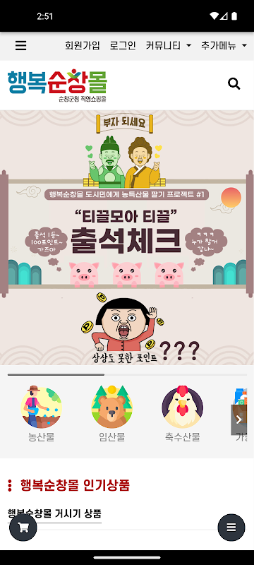 幸福順昌モールは全羅北道順昌郡庁で直接運営する直営ショッピングモールで、淳昌郡民の幸福と地域経済活性化のために設立されました。ここでは純昌の様々な農産物、加工食品、蓄水産物、伝統酒などを新鮮で安全に購入することができます。順昌郡農業技術センターと協力して都市民に高品質の農産物を提供し、地域農家の販路開拓と所得増大を目指して運営されています。