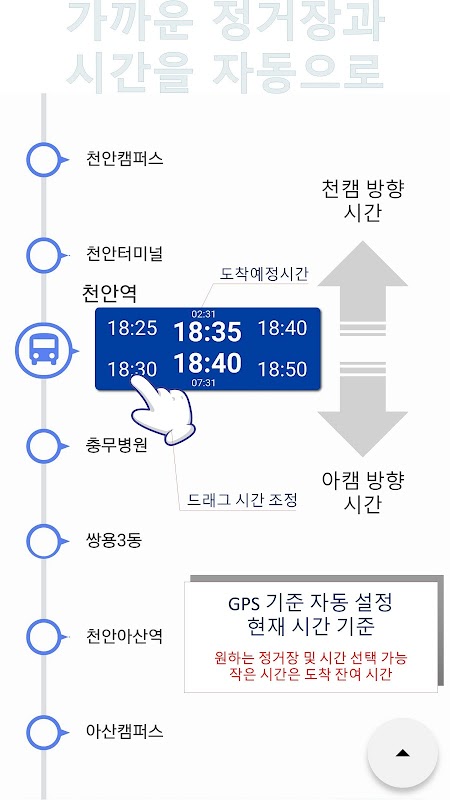 * GPS와 시간을 참조하여 가까운 셔틀장과 시간을 기준으로 자동 표시