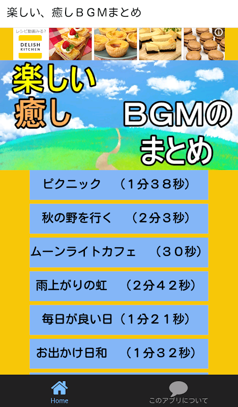 30秒ぐらいの短い曲もあれば、2分あまりある長めの曲もあります。ホーム画面から好みの曲