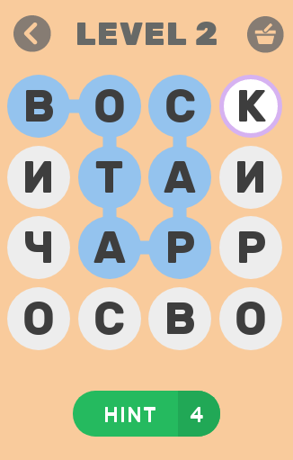 📌Игра начинается с простых уровней и постепенно усложняется более длинными названиями городов и размерами поля поля. Необходимо выделять слова для угадывания названия городов.
