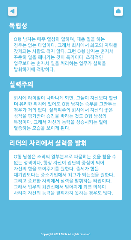 남,여별 4가지의 혈액형 중 하나를 선택 후 알고싶은 내용을 선택하기만 하면 됩니다.