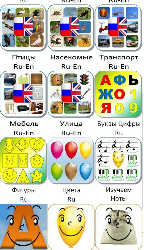 Пособие представляет собой электронное приложение в виде наборов озвученных карточек по разным темам. Каждый набор можно скачать отдельно. После запуска приложения на экране в случайном порядке появляются изображения. При нажатии на изображение произносится название изображенного на картинке на английском языке и подписи на русском и английском языках. Во всех приложениях проговариваются более 60-ти поощрительных фраз на русском языке. Все приложения бесплатные.