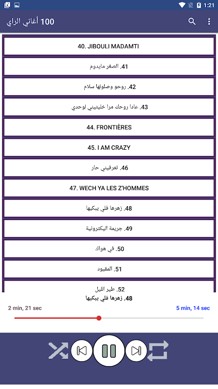 このアプリケーションには、ネットのない最も素晴らしいraiの曲が含まれており、raiの曲はアルジェリアの曲と見なされるため、アプリケーションは、raiの曲とネットのないアルジェリアの曲の愛好家のために設計されました。ライの歌はアルジェリアの民謡ですが、アラブの歌と見なされ、アラブのマグレブで最も人気のある歌の1つと広く知られているため、国際的な歌と見なされます。
