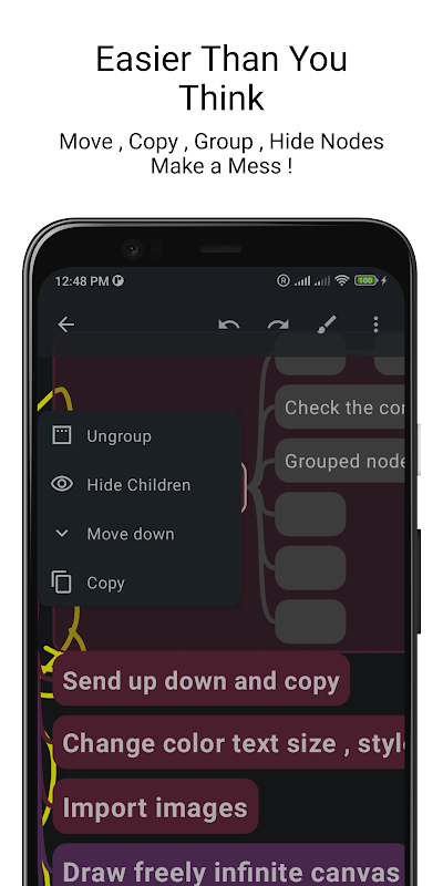 マインド マップのノードを編集する、色を付ける、イタリック体にする、太字にする、取り消し線を付ける、完成したものとしてマークするためにその横にチェック マークを付ける、単一のノードのテキスト サイズを大きくして大きくすることができます。