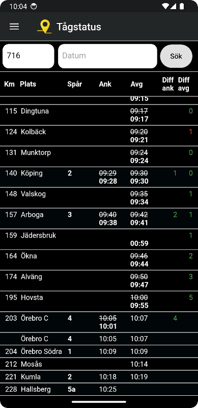 + Pro: Sträckorder + Snabbat upp när man går tillbaka till kartan efter att ha klickat på ett tåg. + Småförbättringar på Tågvy och Tågläge. + Optimerat batteri- och CPU-användning. + Tydliggjort inställda tåg på Station. + Minskat förekomsten av nätverksfel när appen pausas.