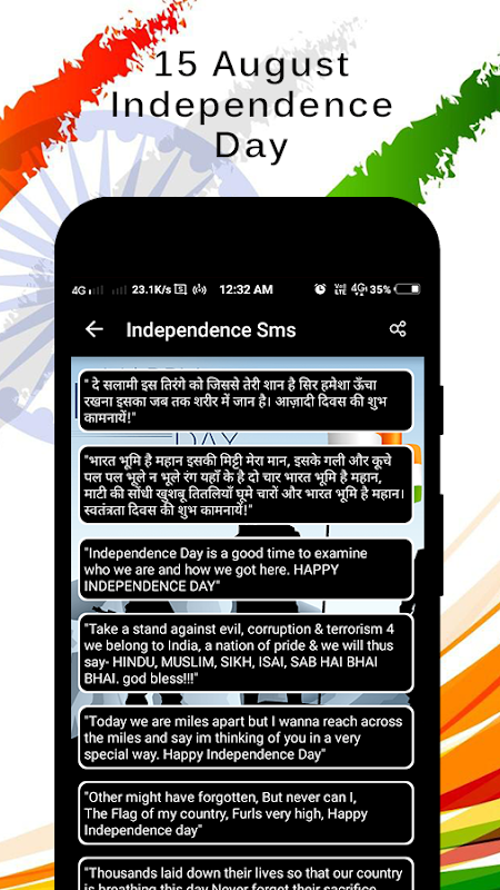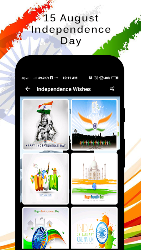 Celebrate this year Happy Independence day with this App & share Joy, Peace & Happiness together with your family and friends by sharing Happy Independence day Wishes.