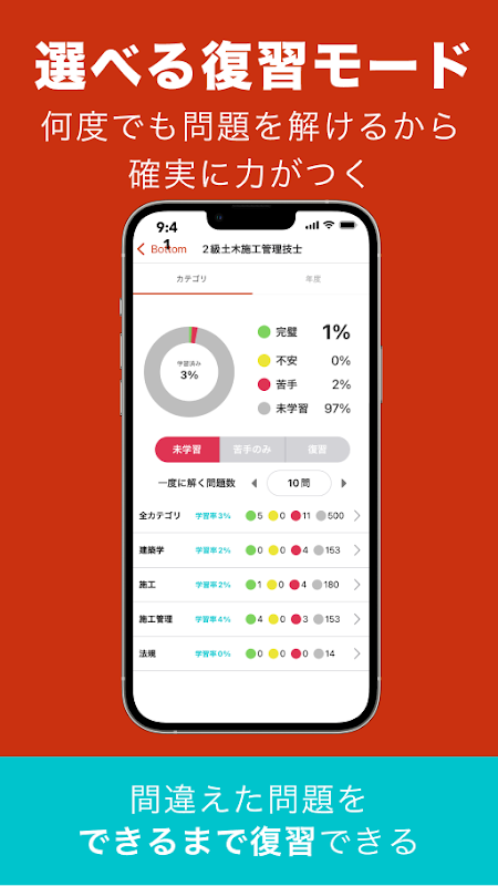 このアプリは、2級土木施工管理に関わる多岐にわたる分野の資格試験準備をサポートします。