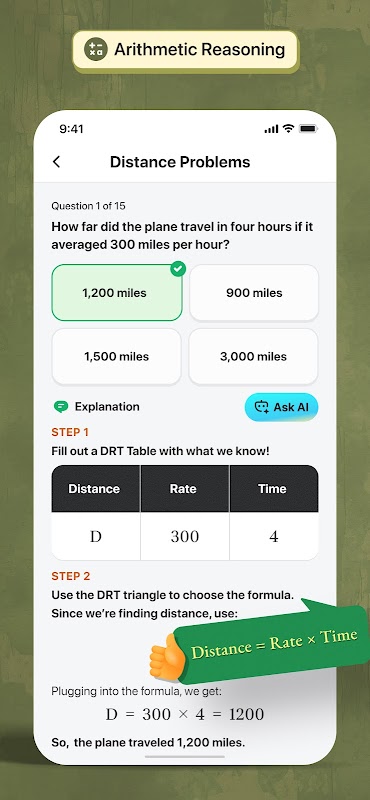 ● 戦術的高速数学トレーニング:電卓を使わない数学の戦術に焦点を当て、算数推論と数学知識のスコア向上をサポートします。分かりやすいステップバイステップのガイダンスで、重要度の高い問題を練習し、実際のASVAB試験と同じ状況で問題を解くための戦略を習得できます。