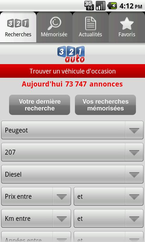 L’application 321auto vous permet de trouver la voiture de vos rêves parmi un large choix de véhicules d’occasion. Spécifiez votre recherche et consultez des dizaines de milliers d’annonces à côté de chez vous !