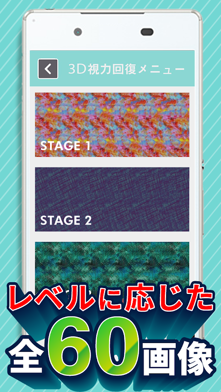 このアプリは3Dのステレオグラム(立体視画像)を用いた視力回復のアイトレアプリです。