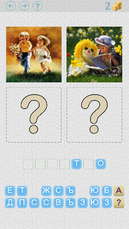 Изначально открыта только одна фотография. Чем меньше картинок вы откроете, тем больше монет получите за отгаданное слово!
