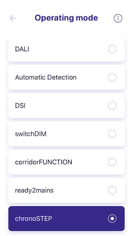 デバイスの動作モードの選択 (DALI、corridorFUNCTION、chronoSTEP など)。