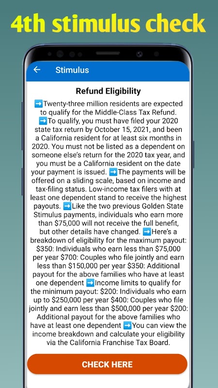 We have created this android application to solve all your questions about first, second, third, and forth stimulus check that the US government approved to all citizens who meets the requirements. Stand by and check periodically our app to stay updated, we will notice you if there is releasen a fifth stimulus check or other additional ones.