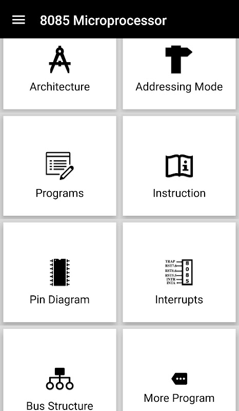 アプリケーションは、より良い8085マイクロプロセッサを知っている学生を支援するために開発しています。迅速な学習のためのアプリケーションは、7つの部分に分かれています。
