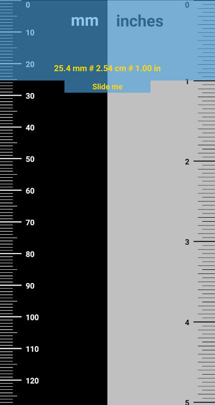 When you don't have a real ruler with you, use your smartphone as one. Slide the tab to measure what you want. Measurement units: millimeters (mm), centimeters (cm), inches (in). An easy-to-use tool.