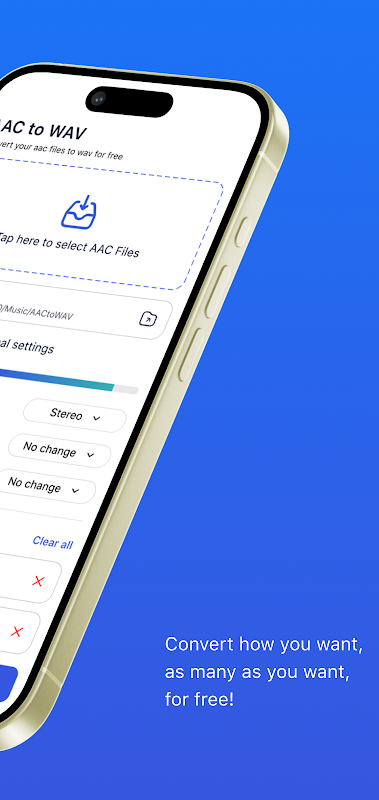 Offline AAC to WAV Converter Unlimited は、効率的で高品質の AAC から WAV 形式へのコンバーターを必要とする人にとって究極のツールです。このオフライン オーディオ コンバーターは、AAC ファイルを WAV に簡単に変換するため、ロスレスで非圧縮のオーディオ品質を求めるミュージシャン、ポッドキャスター、オーディオファンにとって必需品となります。無制限の変換とチャンネルとビットレートの高度なカスタマイズを備えた、プロ仕様の WAV オーディオ ファイルを必要とする人にとって完璧なオフライン ソリューションです。