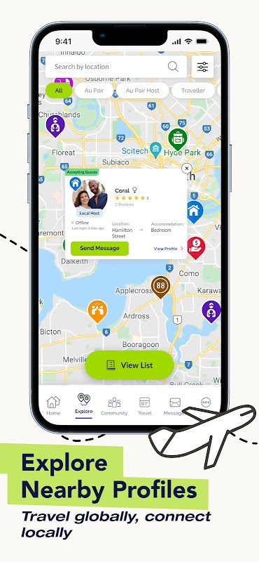 - インタラクティブなマップ/リスト ビューを使用して、スキルやサービスを交換することで、近くの地元のホストから無料の宿泊施設を見つけたり、将来の旅行先を見つけたりできます