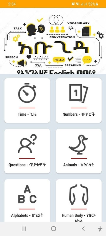 このアプリには、食べ物、時間、数字、動物、形容詞、動詞、基本的なフレーズなどの概念に基づいて適切に編成されたフレーズと語彙があります。アプリの機能の一部が含まれています