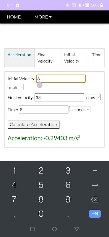 これらの値を取得したら、テキスト ボックス内にこれらの値を挿入し、計算ボタンをタップします。初速度と最終速度を m/s、ft/s、mph、cm/s、km/h 単位で入力できます。