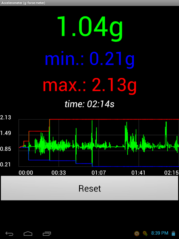 シンプルな向きに依存しない加速度計。あなたの携帯電話を使用して、あなたの体/車/バイク/エレベーター/プレーンまたは他の何に作用する遠心力を測定することができます。アプリケーションは、(重力加速度の多重など)現在の加速度値、最小値、最大値、前回のリセットからの時間を示しています。