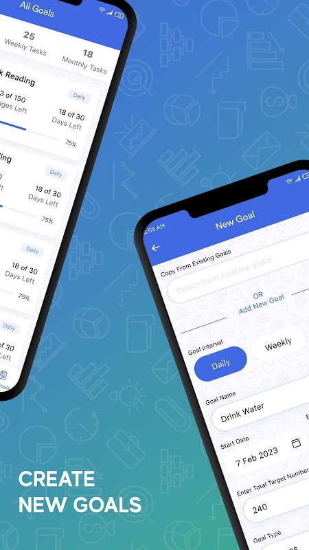 達成することで、特定の期間または日付範囲の目標を設定できます。目標期間全体で達成したい合計数を入力すると、アプリが目標を達成するために必要な毎日、毎週、または毎月の平均数を計算します。日、週、または月に受け取るリマインダー リンクを使用して、進捗状況を入力するたびに、アプリは目標を達成するために必要な平均数を再計算します。