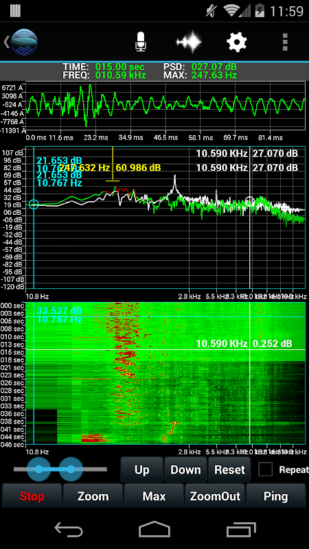 ActivePinger is an App that generates acoustic waveform commonly used by sonar (submarine, bat) and displays the results in real-time. Depending on your surrounding environment, you can see the reverberation after pinging. Unlike most Apps, ActivePinger is actually two Apps combined into one: Signal Generator and Spectrogram display. There are six waveform to choose from: Continuous Wave(CW), Coxcomb, Geometric Comb, Costas Waveforms, Pseudorandom waveform(PRNG) and Hyperbolic Frequency Modulation(HFM) waveform. This tool is great for students and professional engineers studying in the field of sound and vibration since you can see the results of the pinging waveform in real-time. If you are an engineer professional, engineering students, oceanographer, bird watching enthusiast, musician, pianist, guitar and speaker tuning, or interested in signal processing. The app act as an RTA and spectral FFT analyzer and tone generator.