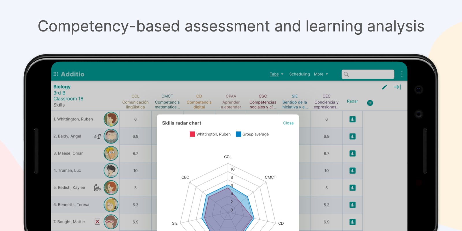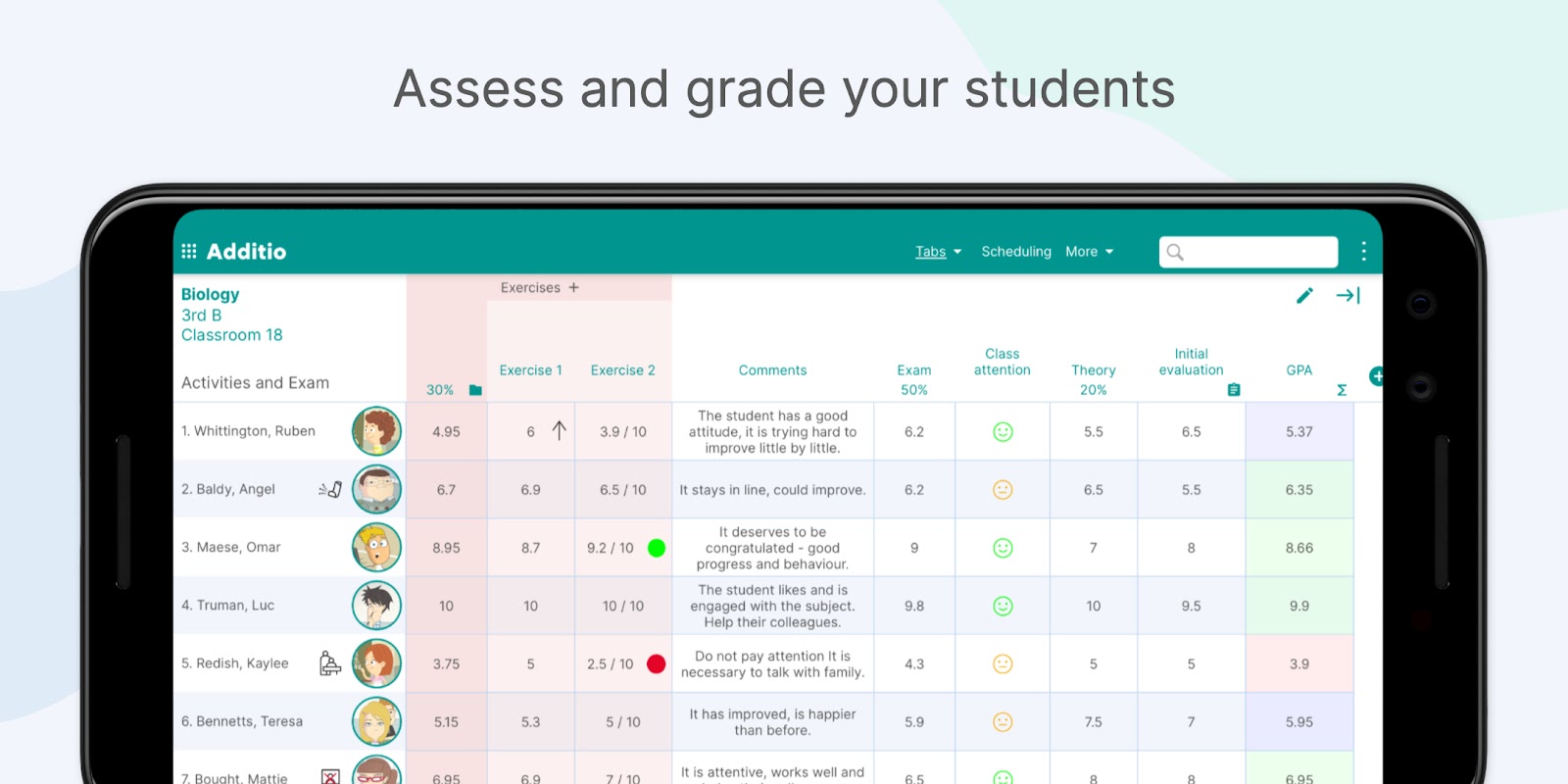 Additioアプリは、授業を簡単かつ直感的に管理するために必要なアプリです。生徒の評価から授業計画、授業スケジュールまで、Additioアプリは管理、評価、コミュニケーションを1つの使いやすいアプリに統合します。