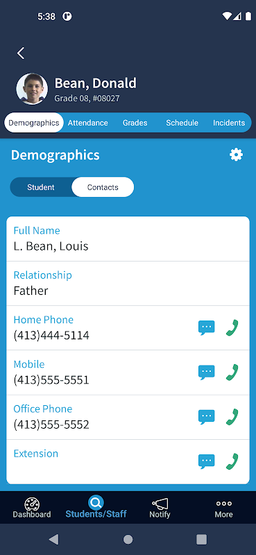 すべての学生、スタッフ、および連絡先を簡単に検索およびスクロールして、すばやく電話、テキスト、または電子メールを送信できます。ユーザーはアプリ内で学校を簡単に切り替えることができます。アレルギー情報やロッカーの組み合わせなど、学生の人口統計フィールドにアクセスします。生徒の欠席や遅刻を確認します。生徒がいつでもどのクラスにいるべきかを知っています。生徒の成績を表示して、生徒の学校での成績を評価します。新しい規律インシデントを入力してください。 AP Notify 機能を使用して、電子メール、テキスト、およびボイス メッセージで連絡先に連絡します。