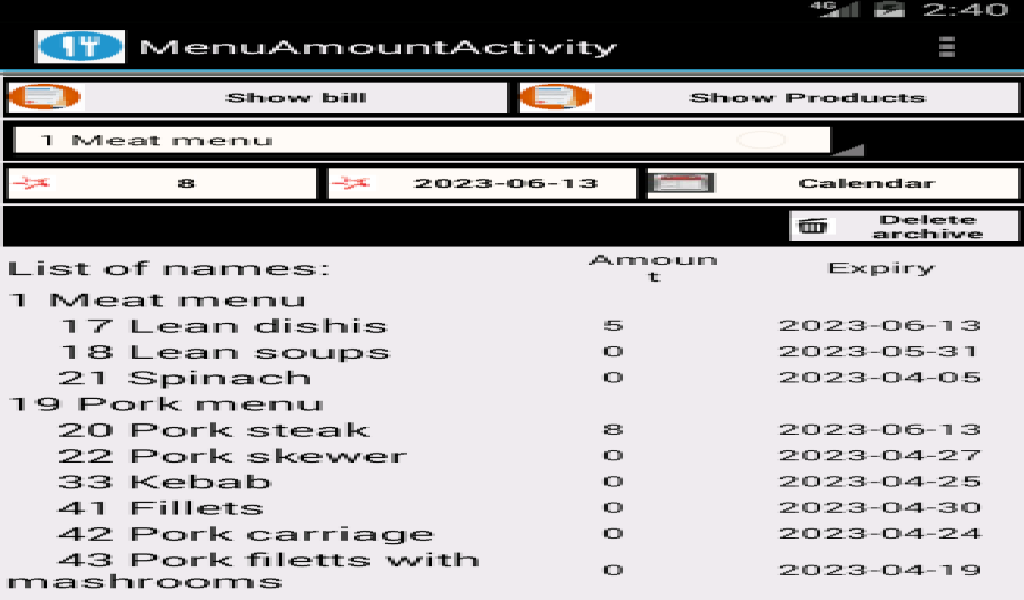 倉庫内の個々の製品の情報には、次の情報が含まれます。 - 製品名。 - 量; - 測定; - 単価; - 合計数量値; - 有効期限; - および登録日時。これにより、1 つの製品について有効期限が異なる多数のバッチを保管することが可能になります。製品情報 (ホーム画面の製品のストア メニュー項目から含まれる) は 2 つのレベルで構成されています。第 1 レベルは肉、野菜、魚介類などの製品カテゴリです。第 2 レベルは指定されたカテゴリに属する製品です。アクティビティ - 製品のストアは、倉庫内の製品を管理する役割を果たします。また、製品カテゴリのリストも提供します。 - オブジェクトのリスト (顧客の場所) - これらは、要求された料理の注文が関連付けられているレストラン内の場所です。 - kg – キログラム、lt – リットルなどの単位のリスト。 「煮る」、「180度で焼く」などの製品の製造方法のリスト。製造方法のリストには、製品が加工されていないことを示す要素も必要です。特別な名前「.....」。