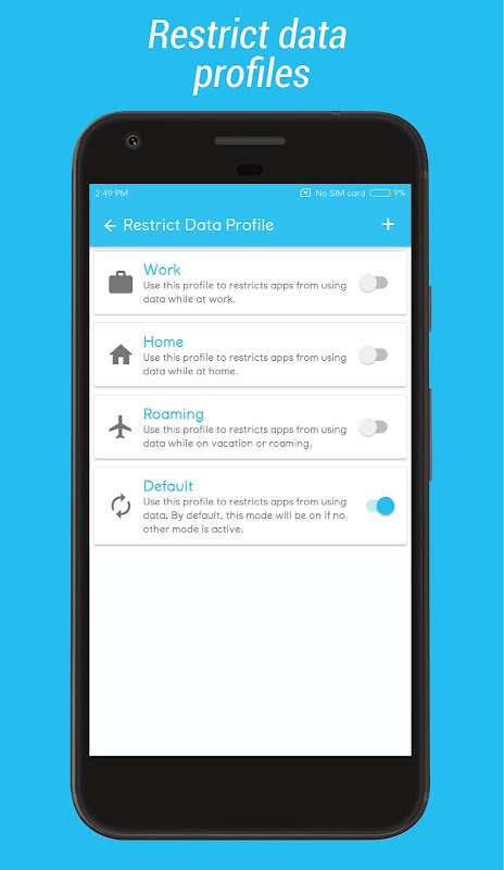 - Restrict Data: Create profiles that can be easily managed to restrict data for specific apps. This means you can create a vacation profile, work profile, and more to ensure you won’t be charged overage fees. For example, you can restrict data usage for certain apps when roaming. Setup multiple profiles in a few clicks.