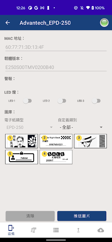 這是一個研華出產的藍芽工具程式,可搭配研華出產的電子紙 (型號:EPD-250, EPD-252, EPD-353),透過手機的藍牙傳輸方式,進行基本圖像的傳遞與顯示。使用者可以透過內建的模板,來製作與自身應用有關的圖片,例如名片卡、價目表、會議室門板、營業時間、備忘錄、貨架標籤、廣告看板等。並且,使用者也可以連上研華出產的電子紙後台管理系統 DeviceOn/ePaper,透過自訂排版的方式,在網頁上製作好模板後,透過網際網路將自訂模板與資料下載下來,提供更多元與彈性的應用。此工具程式內建有相機、相簿,以及影像處理 dithering與色彩增豔的功能,可以透過拍照的方式快速製作名片、產品介紹,其色彩也能呈現如同照片的豐富度。此工具程式可同時最多四台電子紙裝置連線,加速推圖效率。此工具程式也可以對電子紙裝置做韌體升級,以提供額外客製化的服務。