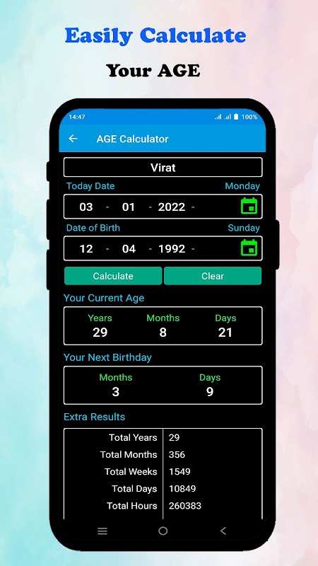 これで、年齢計算機を使用して、実際の年齢を生年月日で計算することが非常に簡単になりました。このアプリケーションは、使いやすいシンプルなユーザーインターフェイスを提供します。誕生日を選んで、合計年齢と次の誕生日を入力してください。