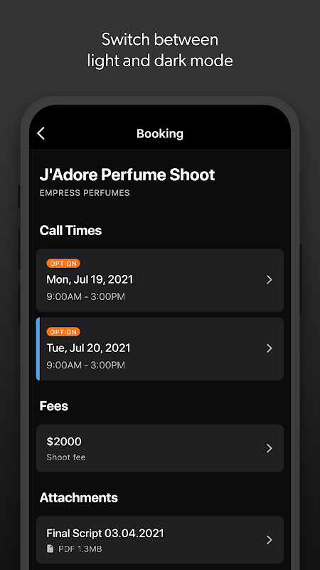 次の仕事の場所を確認したり、その場所を表示したり、Google マップでその場所までの道順を調べたり、Uber や Lyft ですぐに配車を予約したりすることもできます。航空券やオーディション台本などの添付ファイルを表示およびダウンロードすることもできます。