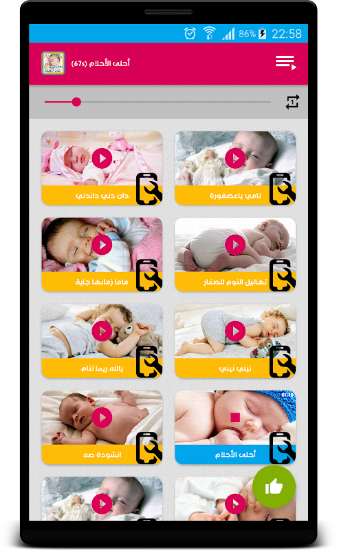 من خصائص تطبيق تهاليل النوم للصغار أنه يشمل الكثير من المقاطع و الأناشيد و التهاليل للصغار ،كما يمكن اضافة الأناشيد للمفضلة و اختيارها كرنة و نغمة الهاتف .
