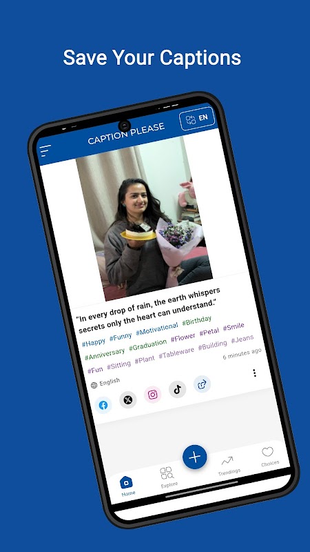 - ソーシャル メディアの統合: Instagram、TikTok、Facebook、その他のプラットフォームでキャプションを直接共有します。リール、ビデオ (静止画)、または投稿のいずれであっても、すぐに使用できるキャプションを使用してコンテンツを簡単に強化できます。