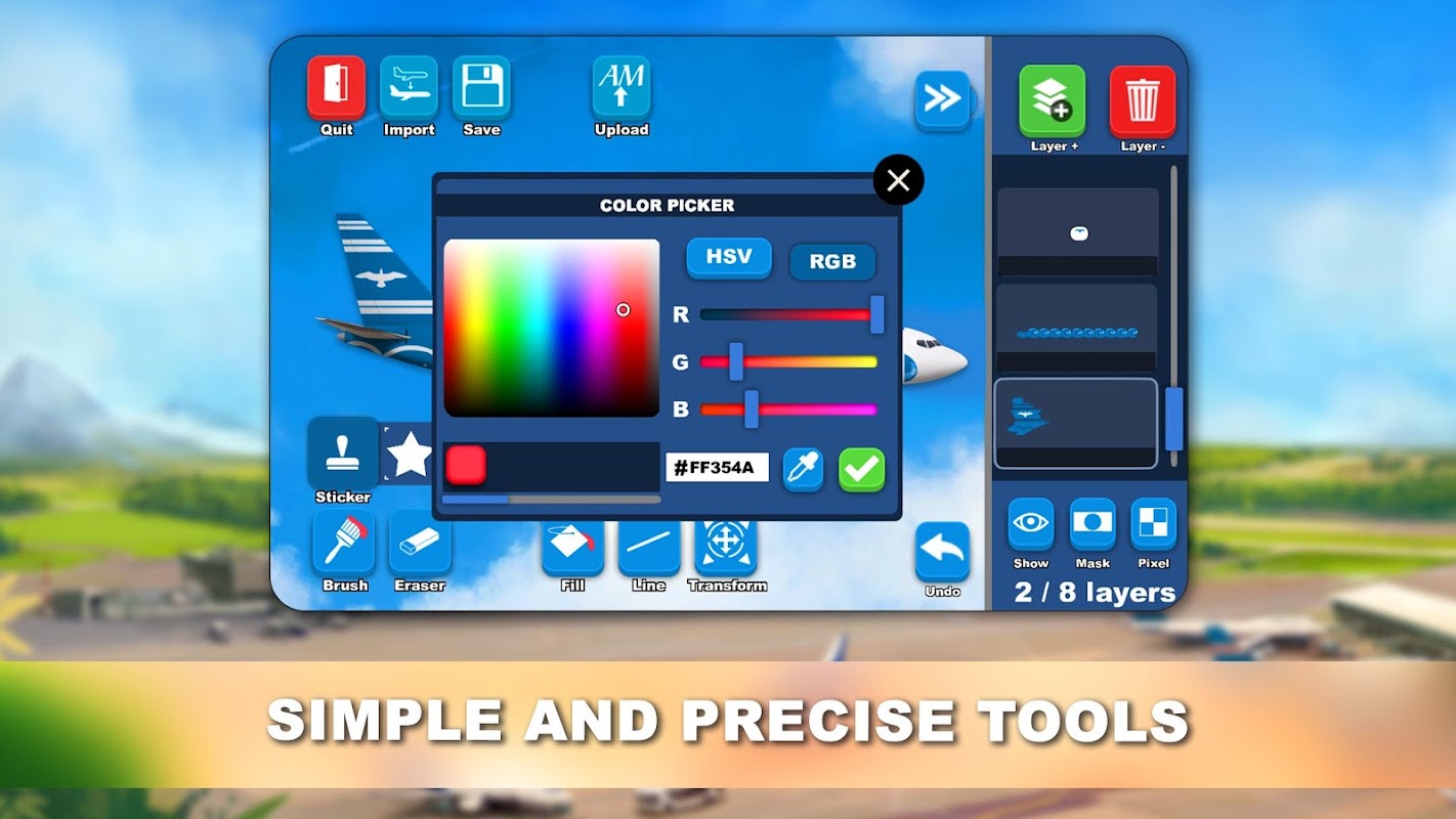 あなたは、そのようなあなたは正確にあなたがカラーピッカーに感謝したい色を選ぶことができ、そこから可変サイズのブラシ、直線、ペンキのバケツやパレットなど、あなたの航空機のすべての部分をペイントするためにあなたの処分で多くのツールを持っています。