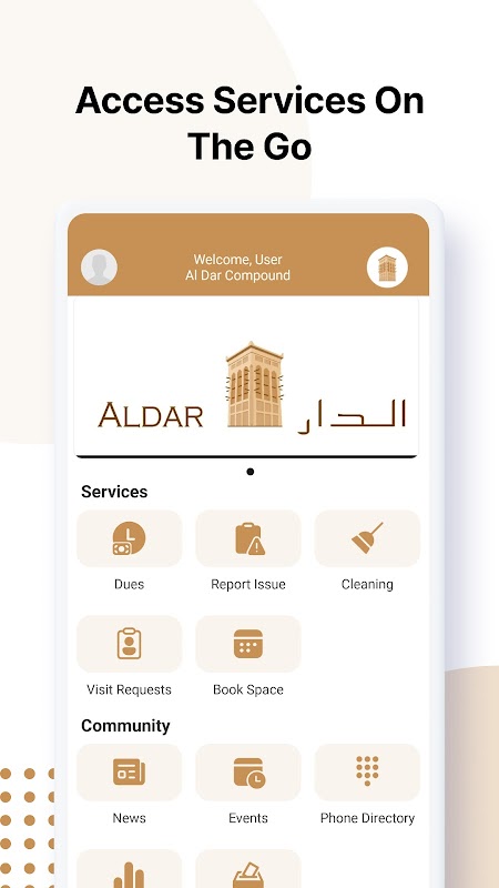 Al Dar Compound Appを使用すると、コミュニティメンバーはすべての出来事を最新の状態に保ち、リクエストを送信して、相互に通信できます。
