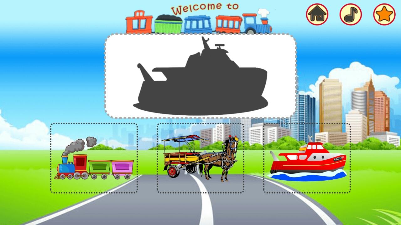 完全な学習アプリケーション、交通ツールを知って、子供のゲーム、推測画像、車の音と色を学ぶ