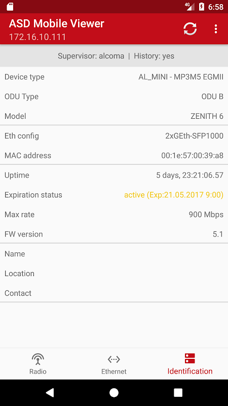 ASD監視システムは、読取部ステータスALCOMA MP100を可能にし、それ以降のモバイル版。アプリケーションは、すべての重要なデータ、アラームやユニットからの統計情報を表示できます。簡単な例。ルーティング接続を可能に、選択された値(RSL、TX電力、SNR、信号品質)のライブチャートを表示することも可能です。
