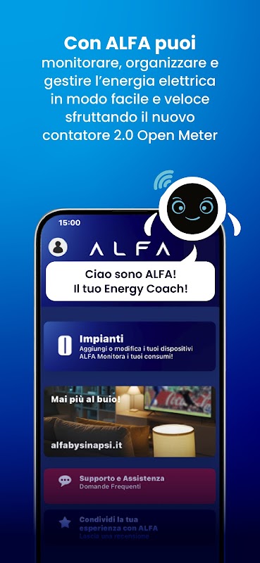 ALFA を使用すると、新しい 2.0 Open Meter 電力メーターで消費量をリアルタイムに制御し、SINAPSI が ALFA 用に設計した APP のおかげでいつでもエネルギー行動を評価できます。 ALFA はあなたのエネルギーコーチです! SINAPSI は、20 年以上にわたり、あらゆる形態(電気、熱、太陽光)のエネルギーを監視するシステムの設計、エンジニアリング、生産を行ってきました。インストールしている ALFA とその APP を使用すると、新しい 2.0 Open Meter メーターから直接読み取ることで、太陽光発電システムの電力消費量と生産量を取得できるようになります。すでにお持ちの場合は「MySinapsi アカウント」を使用してこのアプリケーションにアクセスできます。または、新しいアカウントを作成すると、固有の資格情報を使用して Sinapsi 製品およびサービスの世界に入ることができます。