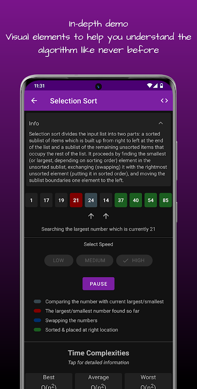 並べ替えアルゴリズムがどのように機能するかを段階的にリアルタイムで視覚化し、アルゴリズムの時間計算量のさまざまなケースを確認できます。