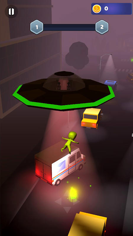 遊び方:画面を長押しして前に走り、UFOが近づいてきたら離してゴミ箱の下に隠れます。エイリアンに捕まる前に目的地まで走りましょう。