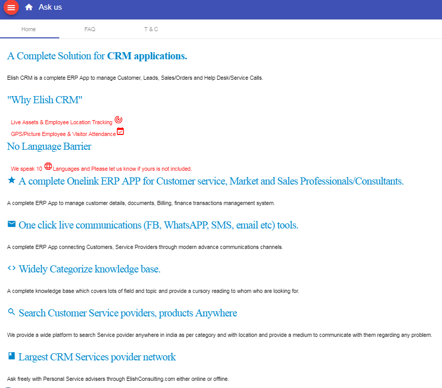 Elish CRM is a complete ERP App to manage Customer, Leads, Sales/Orders and Help Desk/Service Calls.