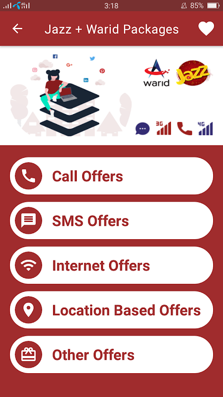 すべてのネットワークパッケージアプリは、すべてのネットワーク(Jazz、Warid、Zong、Telenor、Ufone、さらにはPTCL)パッケージを提供します。このアプリには、すべてのSMS、インターネット(3G、4G)、通話(オンネット、オフネット)、ロケーションベースのパッケージ、およびすべてのSIMのその他の重要なコードが含まれています。