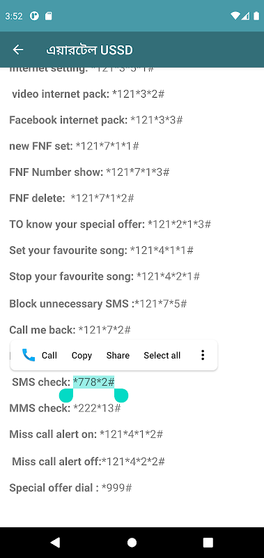সিমের কোড গুলো কপি এবং সরাসরি ফোন কন্টাকে নিয়ে ডায়াল করা যায়
