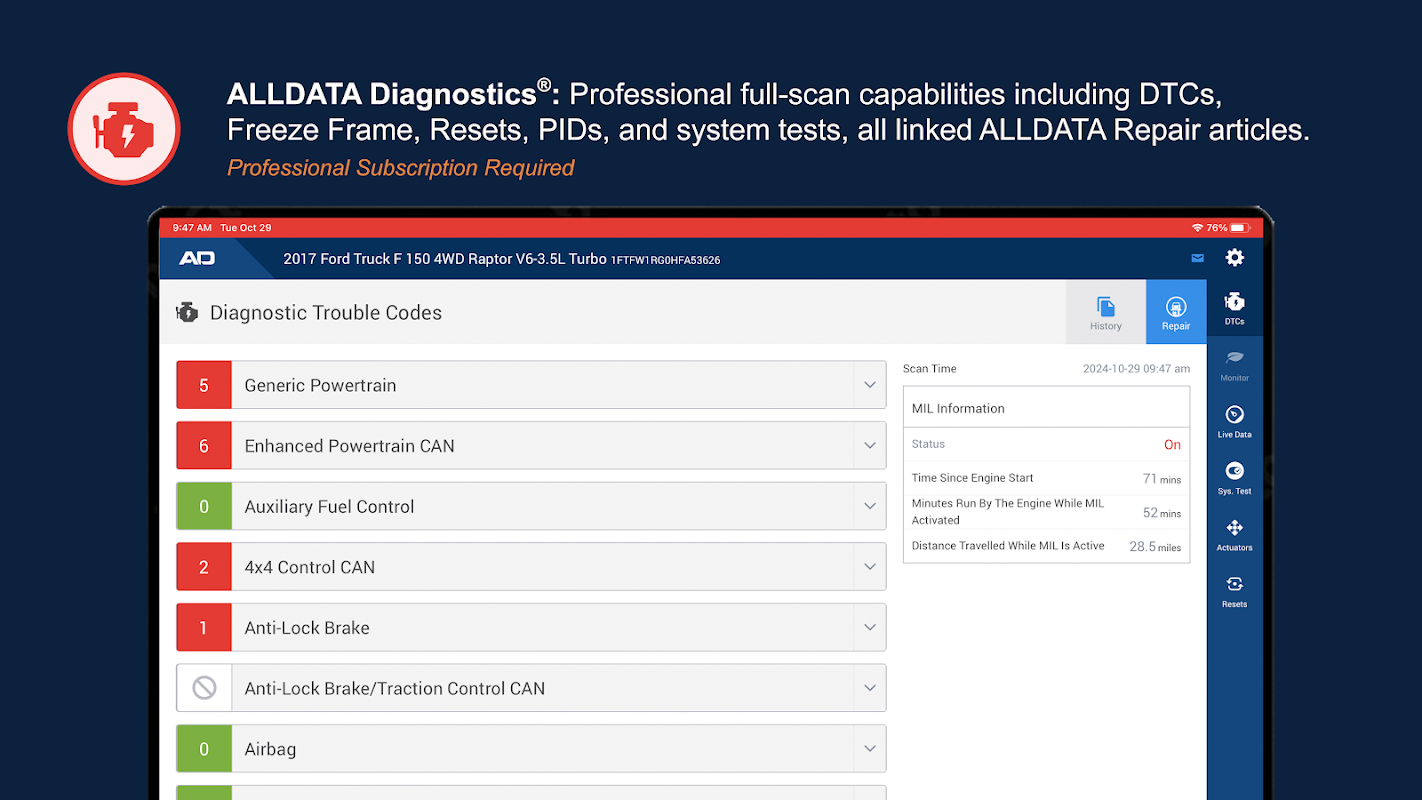 自動車サービス専門家向けの診断および修理情報の大手プロバイダーであるALLDATAは、修理情報にアクセスする新しい方法を提供しています。 ALLDATA Mobileは、専門の加入者が利用できる修理情報であり、今日のタブレット/アプリテクノロジーの利便性、信頼性、耐久性、および低い運用コストを通じて提供されます。 ALLDATA Mobileにより、ユーザーはタッチスクリーン専用に設計された新しい情報グリッドをナビゲートでき、承認されたハードウェアを使用して、車両のOBDIIポートからのデータをALLDATAの修理情報に直接リンクします。