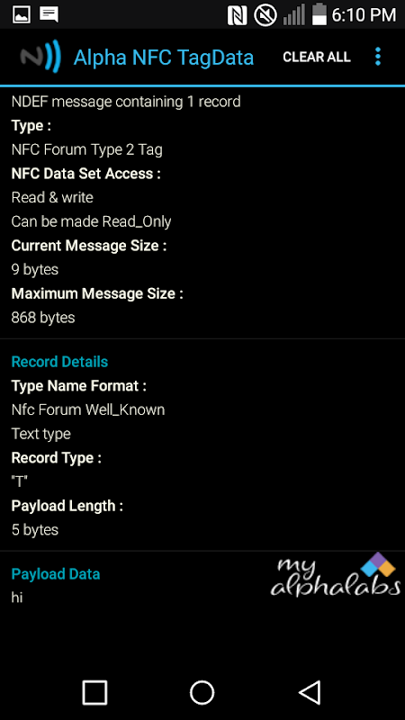 The Alpha NFC TagData™ application reads meta information and data from NFC / High Frequency RFID tags. It is an ideal tool for anyone who is curious about the information stored on their Near Field Communication tags.