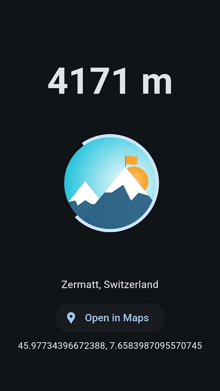 シンプルさと正確さを追求して設計されたこのアプリは、タップするだけで現在の高度を測定できます。中央の画像 (背景に海がある山) を押すだけで、滑らかなアニメーションと画像の周囲に表示されるプログレッシブ読み込みバーで高度がリアルタイムで更新されるのを確認できます。