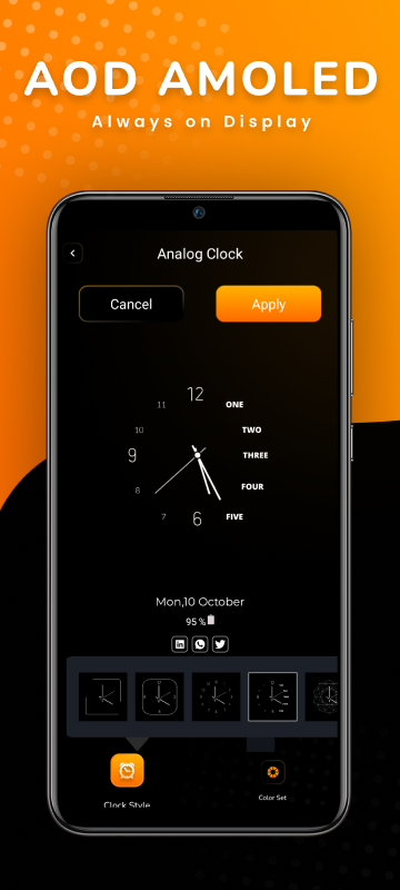 Amoled Clock Always On Display アプリは、常時オンのディスプレイ、絵文字、アモルド時計、スマート時計、およびアナログ時計で継続的に時間を表示します。