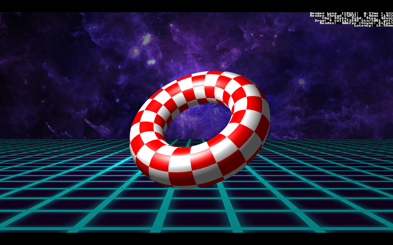 トーラスをアニメーション化しながら、いくつかの詳細なレンダリング・メトリックは、画面の右上に表示されます。トップダウンから: